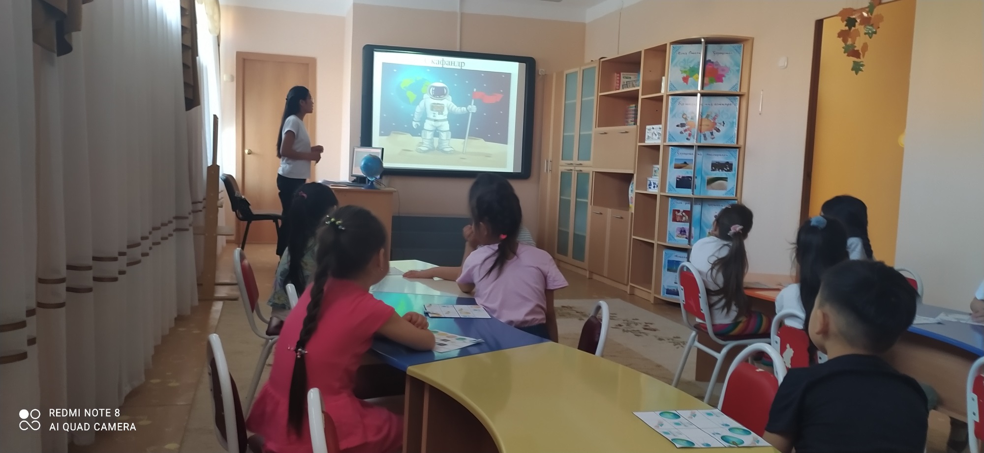 Педагогтар балалар назарын ғарыш тарихымен таныстырып, Қазақстан ғарышкерлері Тоқтар Әубәкіров, Талғат Мұсабаевтың өмір деректерімен таныстырды.
