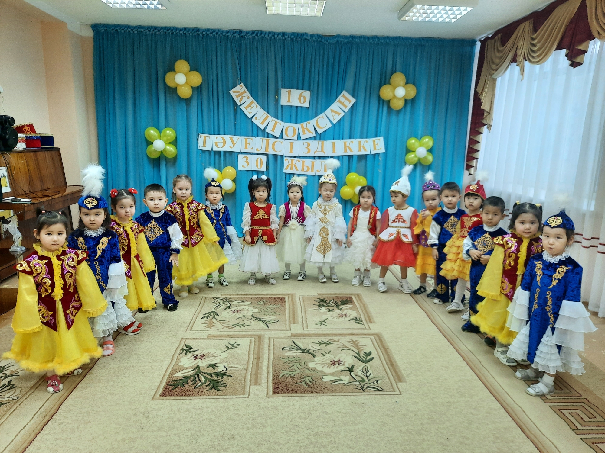 Жуырда, бөбекжай-бақшамыздың қабырғасында Тәуелсіздік күніне және де Тәуелсіздіктің 30 жыл толуына орай балаларға арналған шағын ертеңгіліктер өткізілген болатын.Өткізілген іс-шараға балабақшамыздың ортаңғы айгөлек тобынан бастап,мектепалды даярлық Түймедақ топтарынан жалғасын тапты.Ұйымдастырылып өткізілген іс-шарада балалар Отан туралы тақпақтар оқып, ән айтып, би биледі.Қазақ халқының ежелден келе жатқан ұлттық ойындарын да ойнап көрді.Әр тәрбиеленуші балалардың бойында Отанға деген ыстық ықыласы мен махаббаты бірден сезілді.Қостанай қаласының №5 Гүлдәурен бөбекжай-бақшасының ұжымының атынан барлық Қазақ елін тәуелсіздік күнімен шың жүректен құттықтаймыз.Әр отбасыға амаңдық, дендеріңізге саулық тілейміз.Ең бастысы еліміз аман,халқымыз тыныш болғай!!!