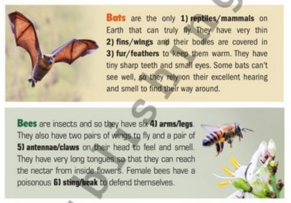 Bats are strange creatures: they have legs and feet but they cannot walk. So, they fly like birds and they are the only animals that can fly. Bats are most common in the tropics, where they can find food all the year round. Most bats are brownish in colour, but others are blackish, orange, grey, greyish green, greenish white, white, yellowish, and some are even spotted.