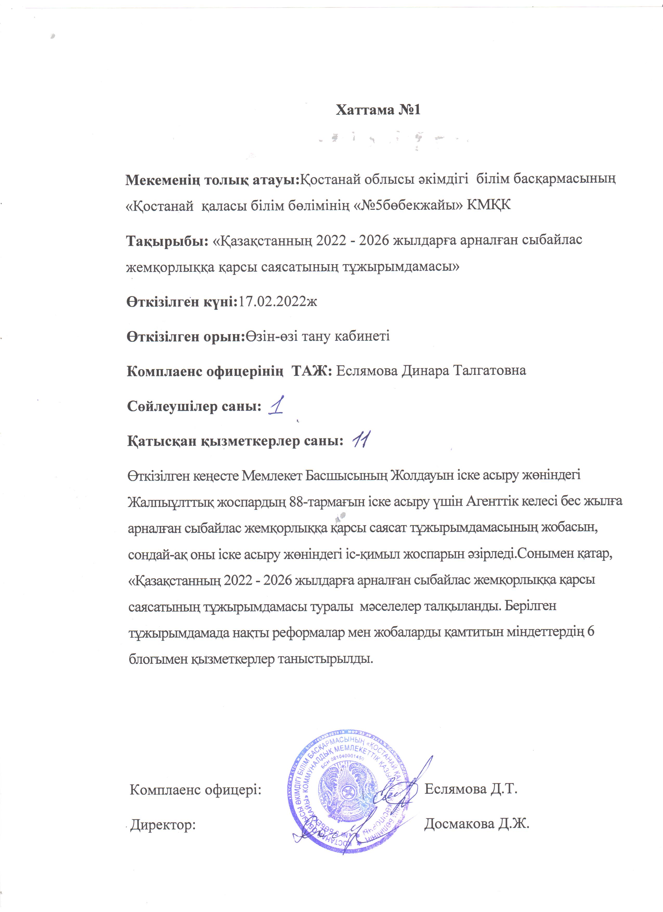 1.07.22-1.07.2023 сыбайлас жемқорлық тәуекелдеріне ішкі талдау жүргізуі туралы БҰЙРЫҚ