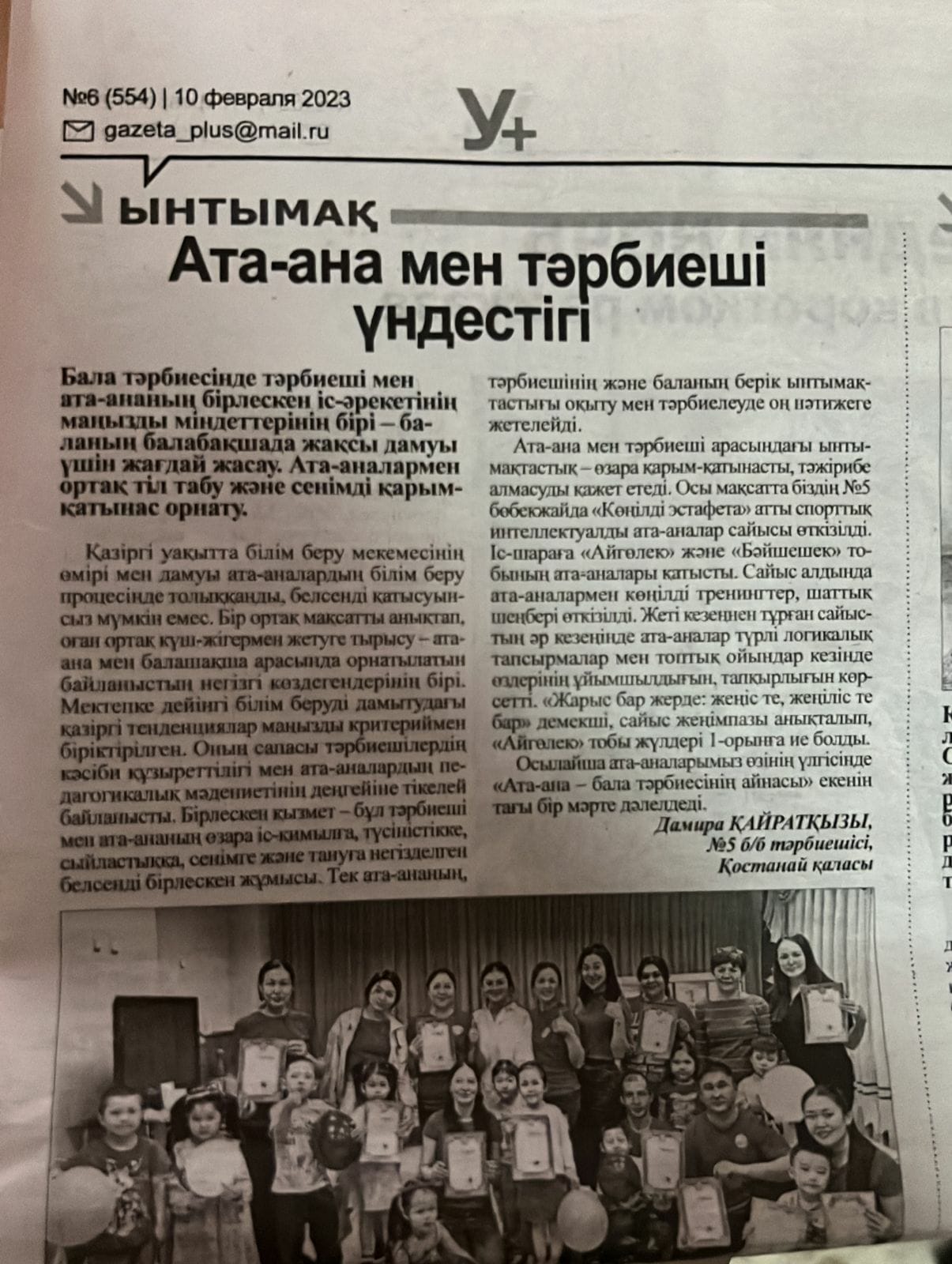 А. Сухомлинский балалардың ата-аналармен жұмыс істеудің маңызына ерекше назар аударып: «Тек ата-аналармен бірге, жалпы күш жігерді біріктіру арқасында тәрбиешілер балаларға үлкен адамдық бақытты беруі мүмкін», – дейді. Сол ұстамында ұстай келе қазіргі таңда 2022-2023оқу жылында Қостанай облысы әкімдігі білім басқармасының «Қостанай қаласы білім бөлімінің «№5 бөбекжайы» коммуналдық мемлекеттік қазыналық кәсіпорнының педагог- тәрбиешілері мен ата- аналары тығыз қарым қатынас жасай келе , әрбір топ өз жұмыстарының жоспарына сай тәрбие жұмысының бастауы ретінде , ата-аналарды еңбек іс-әрекетіне араластырып ( аула тазалау, қардан мүсіндер жасау) атты іс-шараларға, ата- аналарды белсене қатыстырып, қоян- қолтық жұмыс істеуде. Балабақшаның ата- аналармен жүргізілген жұмыстың ерекшелігі осы екі жақтың байланысы мен әрекет бірлігінің тұрақтылығынан көрінеді. Бұл тұрақтылықты ең алдымен топ тәрбиешісі қамтамасыз етуде.
