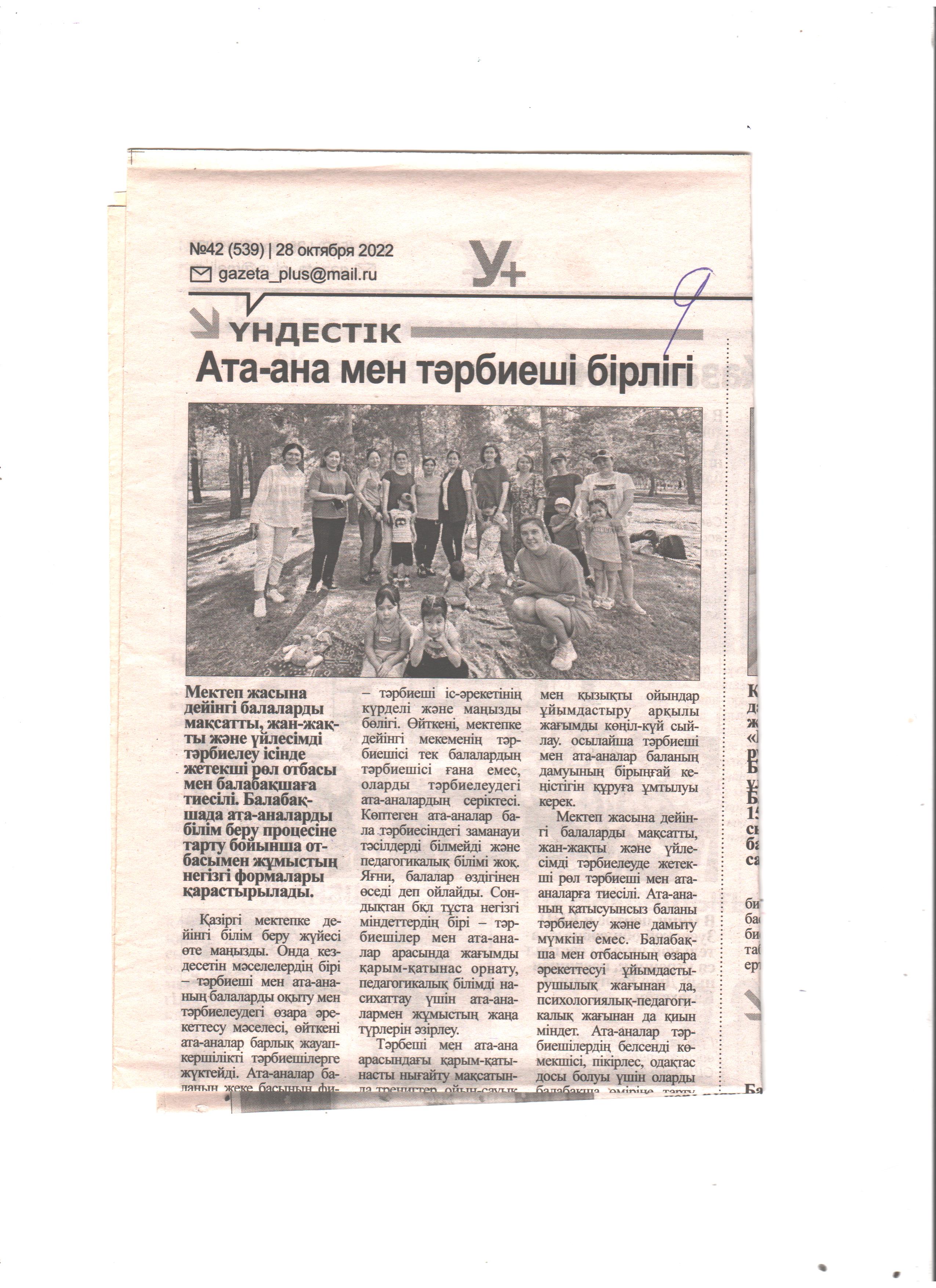 Балабақшада ата-аналар мен бірлесіп қатысуымен өткізілген іс -шараға бөбекжайдағы 4 топ ата-аналары осы бағыттағы іс- шараға терең, белсене ат салысып, қызығушылықпен белсенді жұмыс түрлерін атқарды. Жұмыла көтерген жүк жеңіл дегендей алдағы уақытта ата- аналармен белгілі жұмыс түрлерін ұйымдастыруға, нақтылауға көмектеседі.